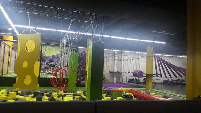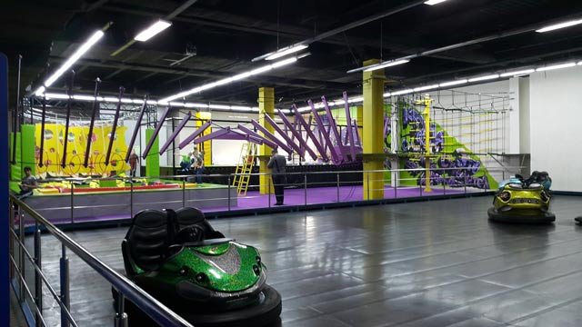 Детская батутная зона. Согласно показаниям инструктора детской площадки "Зимней вишни" Сергея Сочинского, пожар начался в батутной яме. На первом плане сухой бассейн, справа – веревочная трасса.