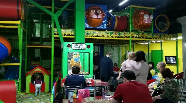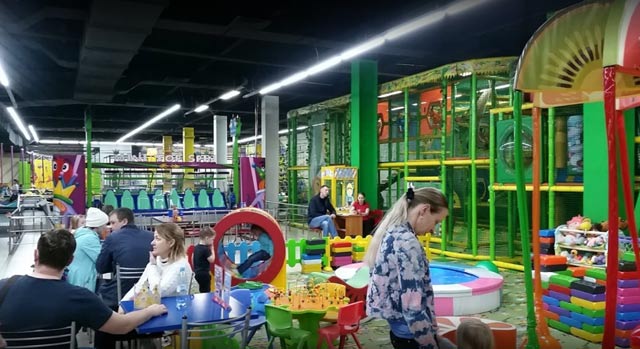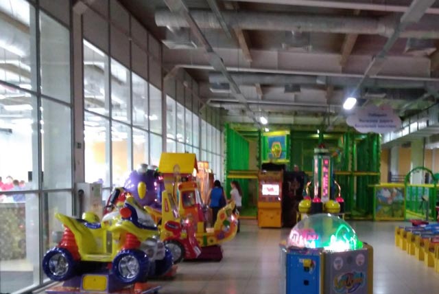 Детский лабиринт примыкал к детскому кинозалу №1. Он выполнен из большого числа пластиковых конструкций. На фото также видна игровая зона с кафетерием.
