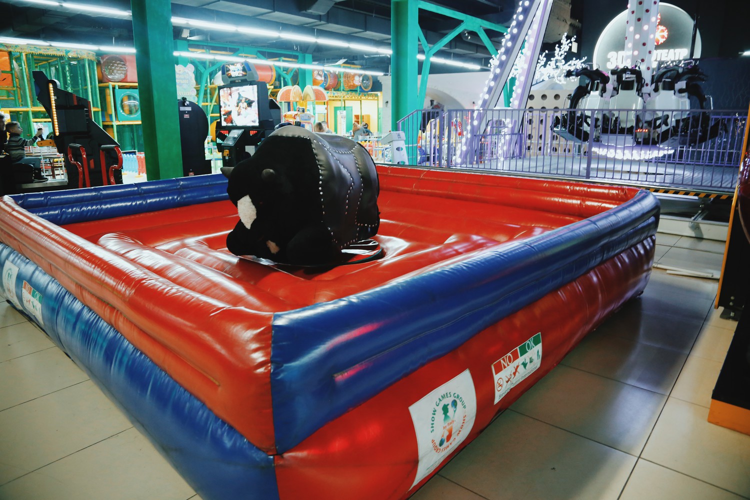 Аттракцион для взрослых с крутящимся торсом быка в центре надувной резиновой подушки. Сотрудники установили "Родео" в центре зала с кафельным полом. После установки аттракциона посетители "Зимней вишни" в соцсетях стали писать, что места на этаже стало значительно меньше – остались лишь узкие проходы по бокам.