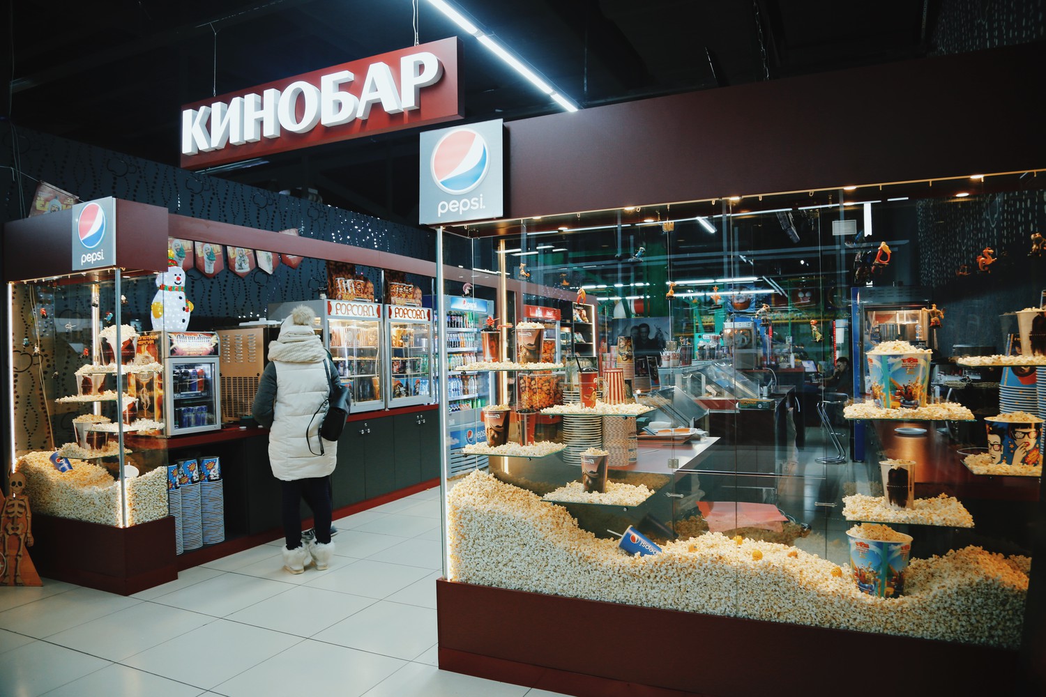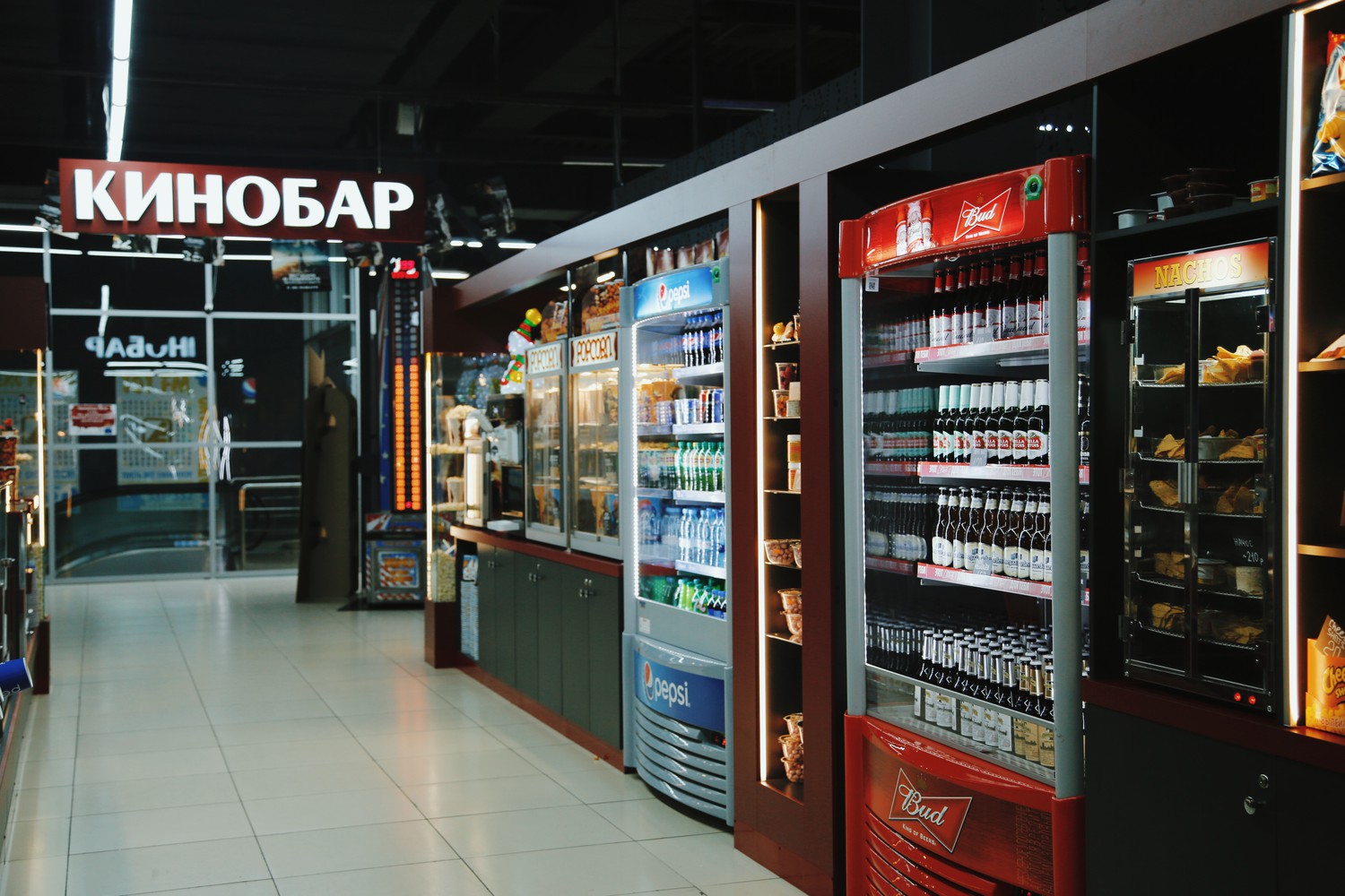 Кинобар располагался с торца кинозала №2. Он также упирался в огражденный стеклом выход с эскалатора.