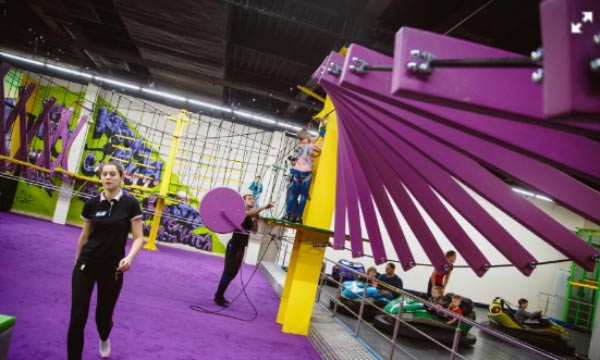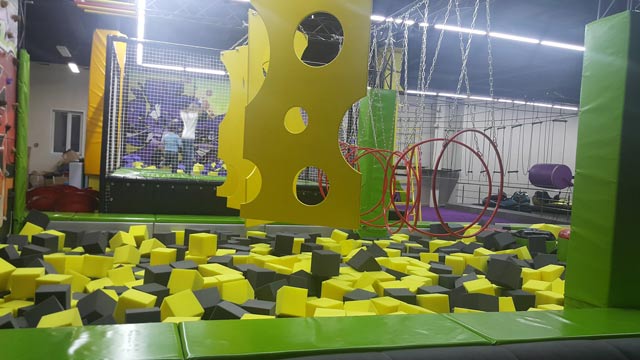 Прямо возле пожарного выхода находился скалодром с сухим бассейном. Справа – батутная зона.